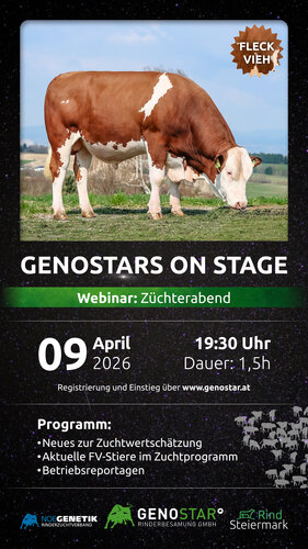 Am Donnerstag, 9.April, wollen wir Ihnen die Neuerungen der April-Zuchtwertschätzung und neue Fleckviehstiere im Zuchtprogramm von GENOSTAR in Bild und Ton präsentieren. Es wird auch wieder Kurzreportagen von den Kuhfamilien auf den Herkunftsbetrieben unserer GENOSTARS geben. Wir starten um 19:30 Uhr.