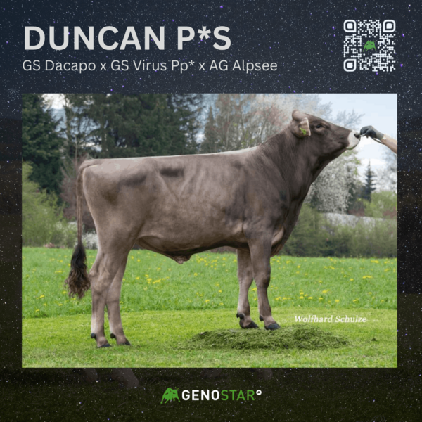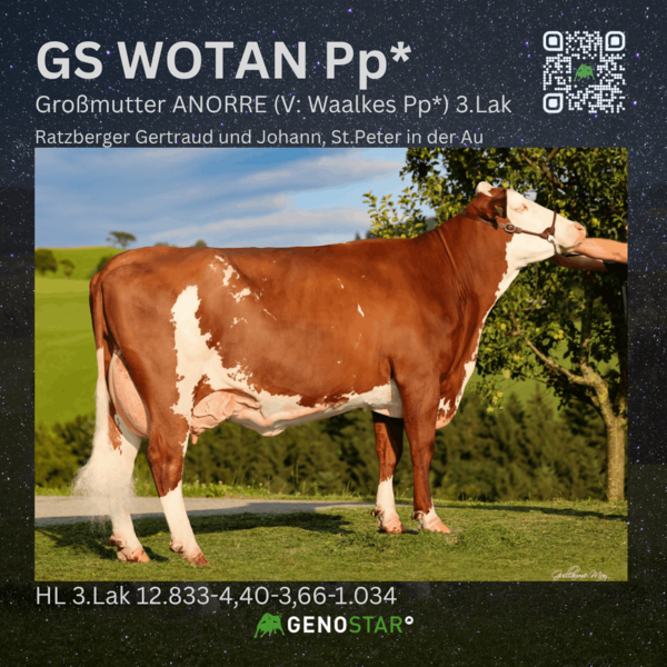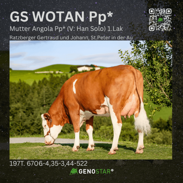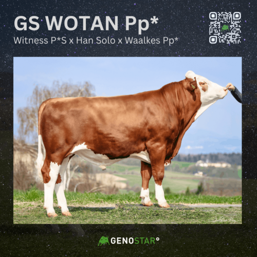 Neu im Angebot von Genostar ist der mischerbig hornlose GS WOTAN Pp*, ein Witness P*S-Sohn aus HanSolo, der bei mittlerer Milchmenge und positiven Milchinhaltsstoffen überzeugt. Im Bereich Fitness sind vor allem die weibliche Fruchtbarkeit sowie die Melkbarkeit hervorzuheben. Seine Töchter zeigen eine gute Voreutereinbindung, ein starkes Zentralband und einen hohen Euterboden.
