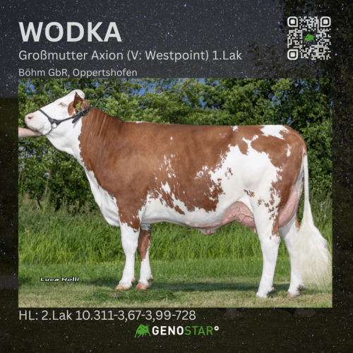 Mit WODKA kann ein Witness P*S-Sohn aus einer sehr populären GS DELUXE-Tochter im höchsten Zuchtwertsegment überzeugen. WODKA bringt mit +1.263 kg eine sehr hohe Milchmengenabweichung sowie beste Fitnesswerte – insbesondere Nutzungsdauer, Fruchtbarkeit und Melkbarkeit sind hier hervorzuheben. Im Exterieur vererbt er große, lange Nachkommen mit korrekter Sprunggelenkswinkelung (93) und hohen Trachten. Die sehr gute Eutervererbung mit 125 Punkten zeigt sich in langen, gut eingebundenen Voreutern mit starkem Zentralband und hohem Euterboden.