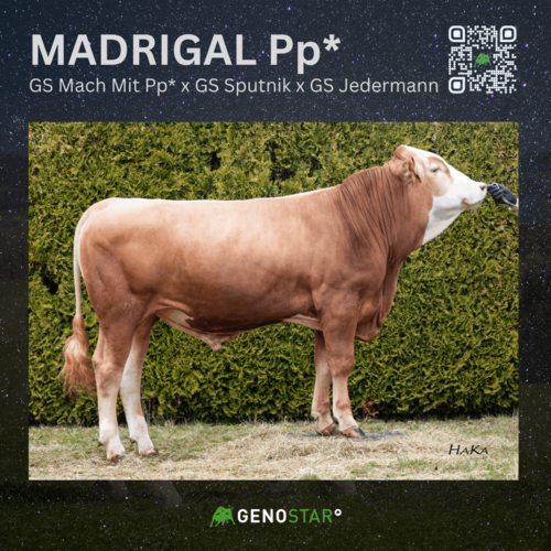 Mit MADRIGAL Pp* steht ein mischerbig hornloser Stier mit sehr hoher Milchmengenvererbung und hervorragendem Exterieur zur Verfügung. Mit +1.161 kg Milch, hoher Nutzungsdauer, guter Eutergesundheit und guter Melkbarkeit empfiehlt er sich für einen breiten Einsatz. Sein Exterieur unterstreicht dies zusätzlich – deutliche Verbesserung im Rahmen, korrekte Sprunggelenkswinkelung und eine Eutervererbung, die keine Wünsche offenlässt.