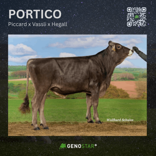 Der Parsival-Sohn GS POPEYE Pp wird voraussichtlich ab Mitte Mai verfügbar sein und überzeugt zusätzlich im Fitnessbereich (FIT 117). Besonders in der Eutergesundheit und Zellzahl hebt er sich deutlich ab (120/117). Sein sehr ausgeglichenes Linearprofil lässt gut bemuskelte Kälber bei moderater Größe sowie hervorragende Euteranlagen (129) erwarten. Die Mutter Visor PS Tina wurde in der ersten Laktation mit 84 Punkten bewertet und zeigte besondere Stärken im Becken (91 Punkte).