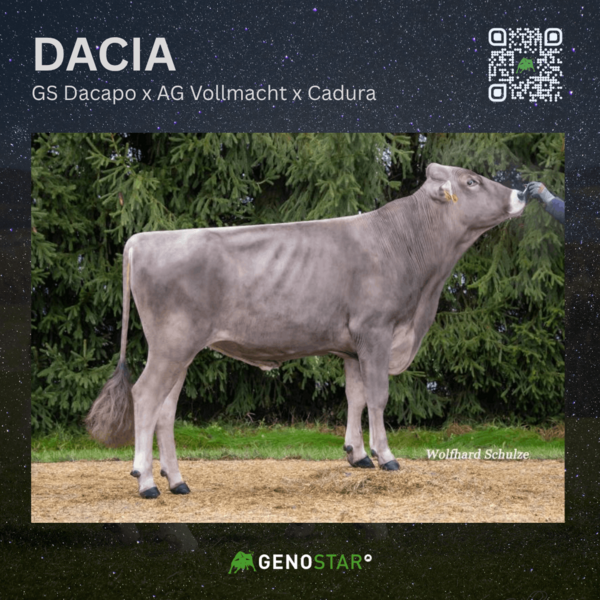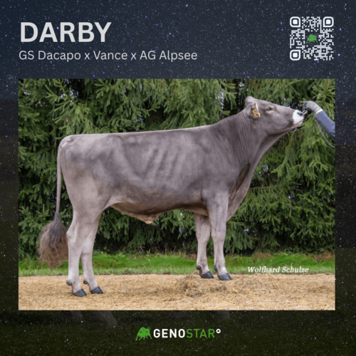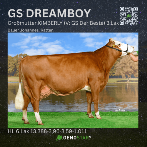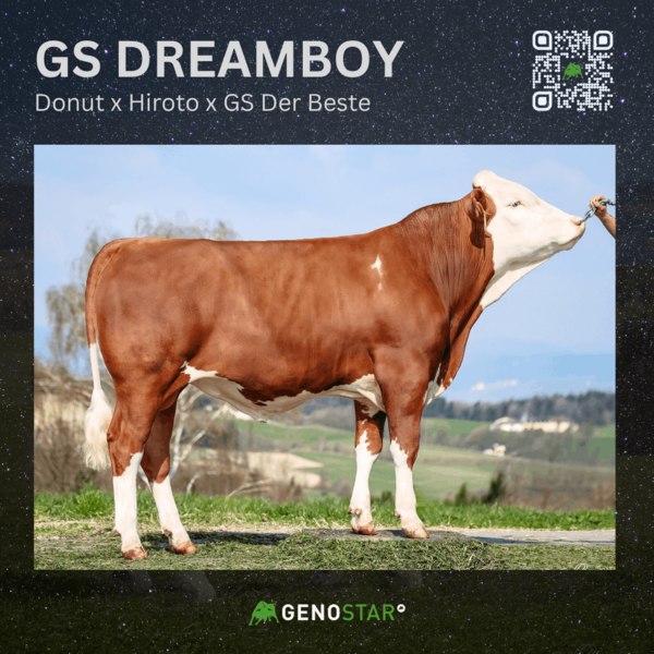 Ebenfalls neu aus dieser Kuhfamilie ist der DONUT-Sohn GS DREAMBOY. Er überzeugt mit hoher Milchmenge, sehr guten Werten in Nutzungsdauer, Persistenz und Melkbarkeit sowie einem für diese Linie typischen Exterieur: mittelrahmige Tiere mit hervorragenden Eutern, insbesondere in Bezug auf Einbindung, Zentralband und Euterboden.