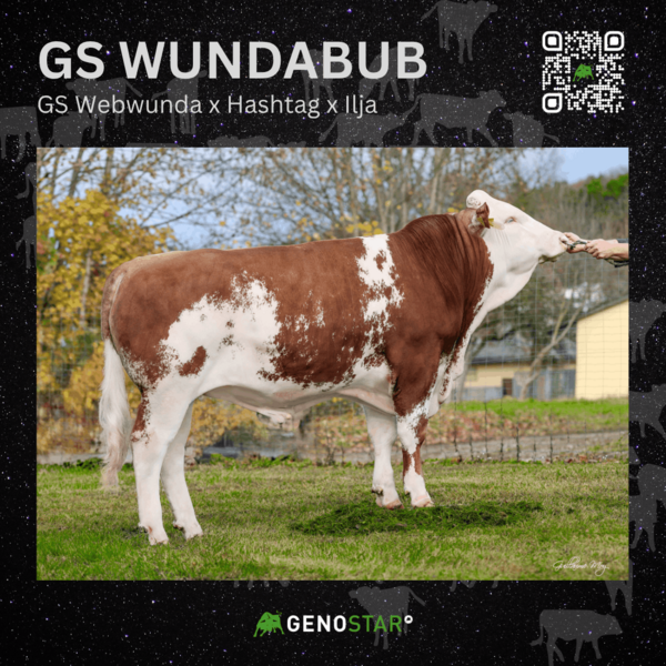 Mit GS WUNDABUB ist ein absoluter Allrounder im Einsatz. Mit +920 kg Milchmengenabweichung sowie starken Fitnesswerten. Im Exterieur bringt er Nachkommen mit viel Kapazität hinsichtlich Länge, Breite und Tiefe. Auch seine männlichen Nachkommen zeigen hohe Nettotageszunahmen und eine gute Handelsklasse.