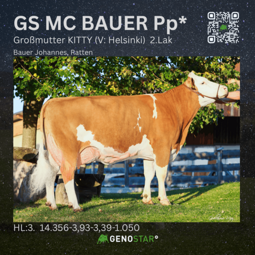 Mit den Stieren GS MC BAUER Pp*, GS MILKFIT, GS ZIO und GS DREAMBOY stehen vier Vertreter aus der amtierenden Bundessiegerkuhfamilie im Angebot. GS MC BAUER Pp* ist ein intensiv genutzter Mangan-P*S-Sohn, der mit knapp 1.000 kg Milchmengenabweichung und sehr hohen Fitnesswerten überzeugt. Im Exterieur verbessert er Kapazität und Fundament und trägt wesentlich zur Verbesserung der Euterqualität bei.