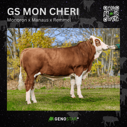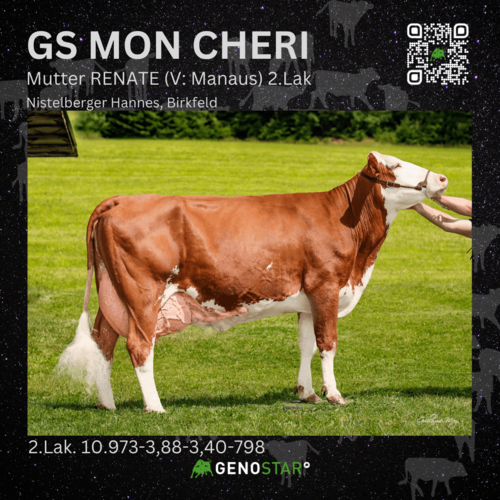 GS MON CHERI ist ein international gefragter Anpaarungspartner in den Zuchtprogrammen. Durch seine hohe Milchmenge, gepaart mit positiven Eiweißwerten, ergibt sich ein Milchwert von 132 Punkten. Bei langer Nutzungsdauer und sehr gutem Kalbeverlauf paternal eignet er sich auch für die Kalbinnenbesamung. Im Exterieur bringt er mittelrahmige Tiere mit korrekten, fein ausgeprägten Sprunggelenken sowie langen Vor- und Schenkeleutern mit starkem Zentralband.