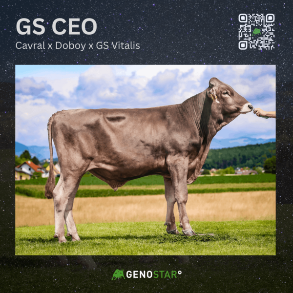 GS CEO gilt aktuell als der Stier der Stunde, der Leistung und Exterieur auf hohem Niveau vereint: Mit über +1000 kg Milch und einem Exterieurwert von 127 nimmt er in diesem Segment eine Spitzenposition ein. Erwartet werden großrahmige Nachkommen mit etwas geringerer Bemuskelung und sehr guten Eutern. Auch die mütterliche Linie konnte bereits auf Schauen mehrfach erfolgreich überzeugen.