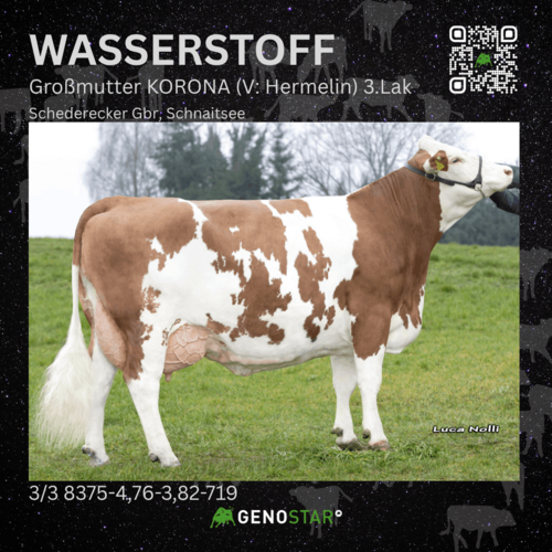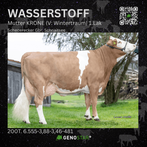 WASSERSTOFF ist nach wie vor das Maß der Dinge im Milchwertbereich und erreicht hier 137 Punkte. Er kombiniert eine hohe Milchmenge (+1.319 kg) mit positiven Inhaltsstoffen sowie guter Nutzungsdauer und einem Eutergesundheitswert von 111 Punkten. Seine Töchter sind mittelrahmig, stehen auf sehr feinen Fundamenten und überzeugen mit Eutern hinsichtlich Strichlänge und -dicke.