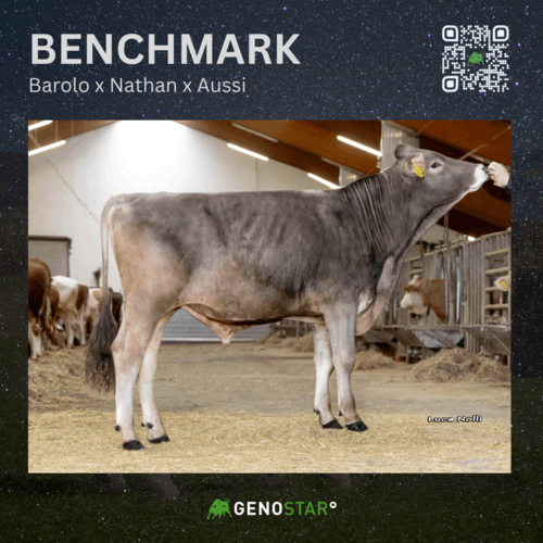 Ebenfalls ab Mitte Mai verfügbar ist der Stier BENCHMARK (Barolo x Nathan). Dieser Newcomer vereint Leistung und Exterieur auf überzeugende Weise: Mit über +900 kg Milch und einem FIT-Wert von 113 verspricht er Nachkommen mit sehr starkem Gesamtexterieur. Besonders hervorzuheben sind die Werte im Linearprofil für das Becken: Mit 128 in der Beckenlänge und 122 in der Beckenbreite hebt er sich klar von der Konkurrenz ab.