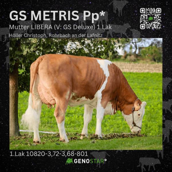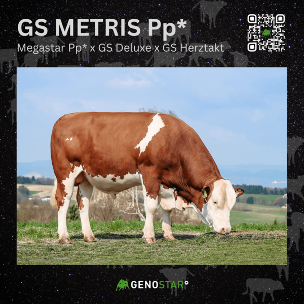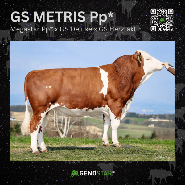 Ein Stier, der diesen hohen Ansprüchen gerecht wird, ist GS METRIS Pp*. Er platziert sich in den Toplisten der internationalen Fleckviehzucht und kann mit den Attributen Leistungsbereitschaft sowie positiven Milchinhaltsstoffen bei sehr guter Fitness punkten. Besonders in den Bereichen Nutzungsdauer, Eutergesundheit und Melkbarkeit bringt er deutlichen Fortschritt. Im Exterieur vererbt er Nachkommen mit korrekt gewinkelten, feinen Sprunggelenken und Top-Eutern – hinsichtlich Voreutereinbindung, Euterboden sowie der Tendenz zu längeren, dickeren Strichen lässt er keine Wünsche offen.