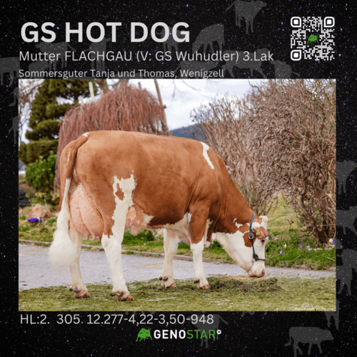 GS HOT DOG kann mittlerweile als Fixstarter in der Topliste angesehen werden – der leistungsbereite Heiss-Sohn aus GS Wuhudler überzeugt neben hoher Milchmenge auch durch die Stärken seines Muttervaters GS Wuhudler, insbesondere in der hoch positiven Fundamentvererbung sowie im Bereich der Fitness. Hervorzuheben ist hier vor allem die Nutzungsdauer sowie der hohe Persistenzwert von 124 Punkten, welcher eine besonders flache Laktationskurve erwarten lässt.