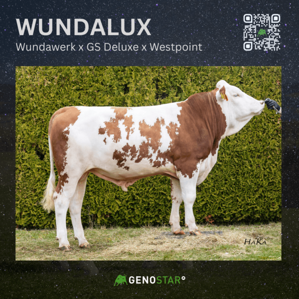 WUNDALUX ist der kompletteste WUNDAWERK-Sohn aus einer überragend typisierenden GS DELUXE-Tochter. Mit +830 kg Milch bringt er neben solider Milchleistung vor allem Fitness und Exterieur auf allerhöchstem Niveau – Nutzungsdauer 132, Eutergesundheit 134 und Melkbarkeit 111 sowie 134 Punkte in der Mastitisresistenz sprechen klar für einen breiten Einsatz. Im Exterieur überzeugt er mit viel Kapazität, korrekt gewinkelten, feinen Fundamenten sowie Eutern, die bestens in die Bauchdecke eingebunden, hoch angesetzt und mit perfekter Strichplatzierung vorne wie hinten ausgestattet sind.